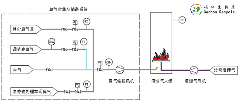 公司在武漢某垃圾填埋場對原有填埋氣火炬改造,目的是利用新火炬系統(tǒng)在燃燒填埋氣時燃燒產(chǎn)生的熱量,對于填埋場滲濾液處理設(shè)施產(chǎn)生的臭氣進(jìn)行熱氧化除臭。垃圾滲濾液調(diào)節(jié)池及垃圾滲濾液處理車間產(chǎn)生的臭氣集中收集后用管道通過風(fēng)機輸送至火炬配風(fēng)口混入火炬焚燒。在臭氣管道上設(shè)置氣體濃度分析儀、緊急切斷閥等安全保護(hù)裝置,保護(hù)裝置與輸送風(fēng)機、火炬連鎖控制。
